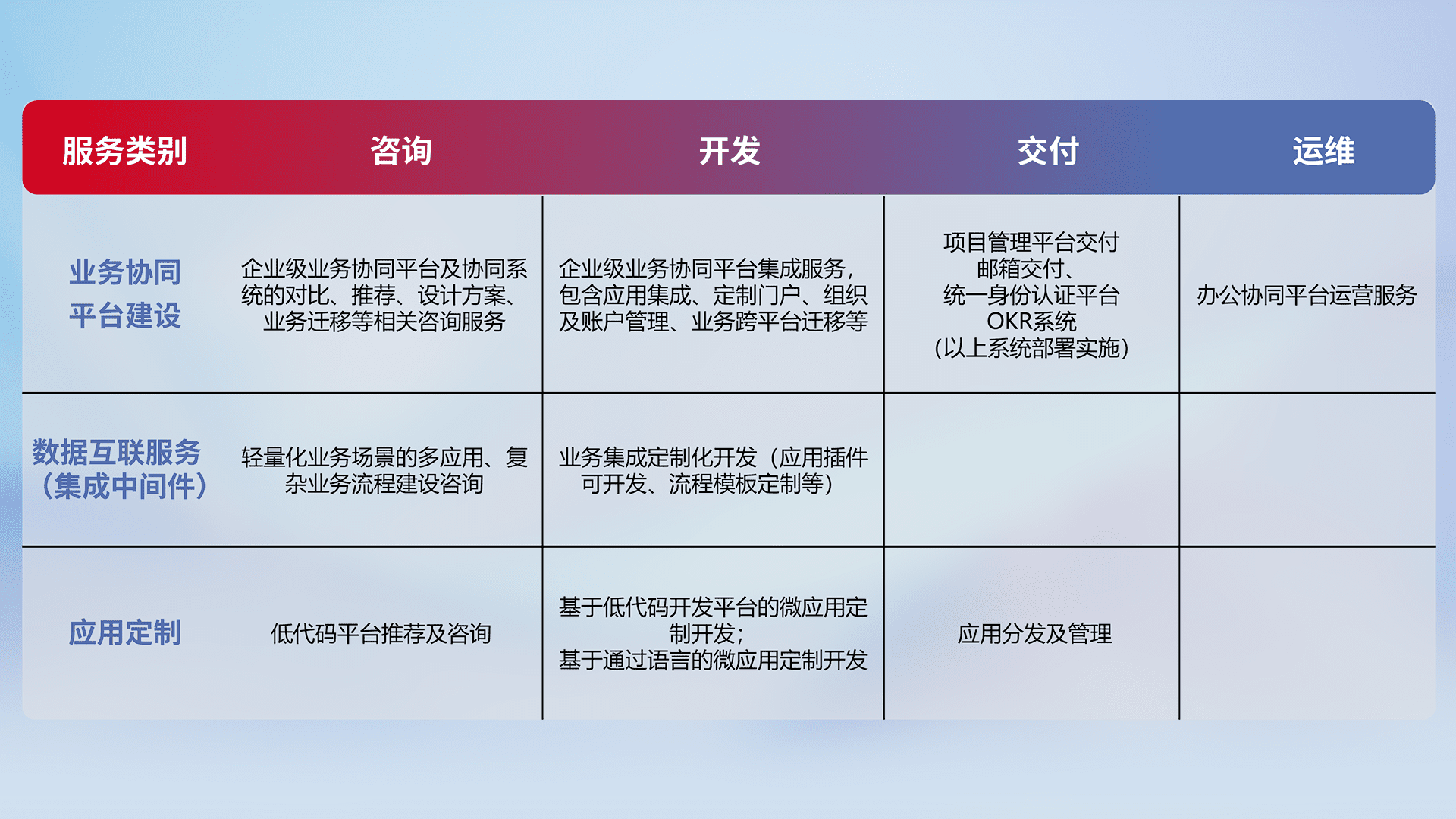 针对钉钉、、、、企微、、IDaas等平台级产品提供产品的规划、、方案、、、、交付、、、、定制化开发等服务,,,,实现如统一协同办公、、、、智能客户服务、、混合会议管理、、、、智能数据查询、、等业务场景,,,,实现数字化转型。。。。